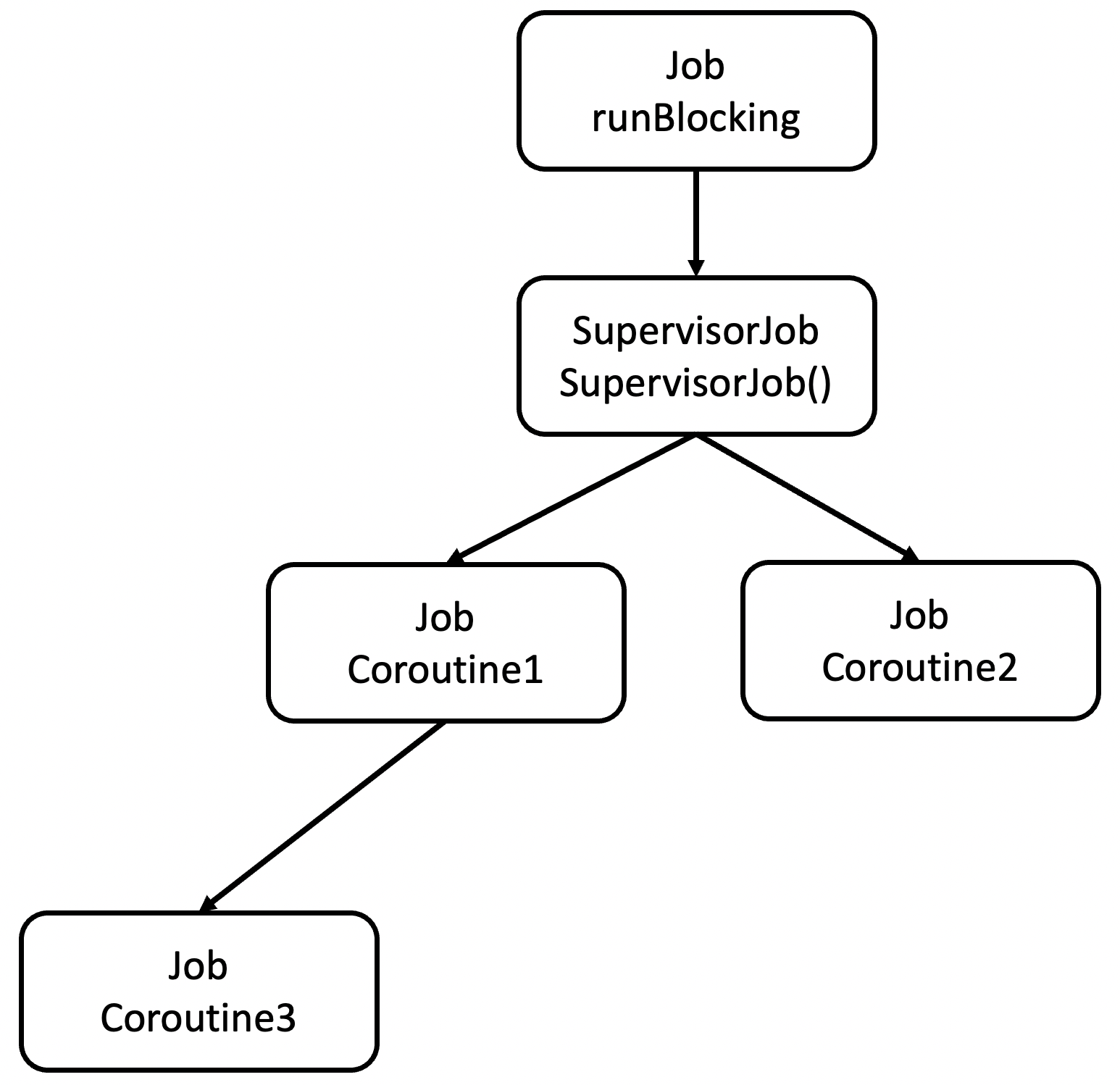 supervisorScope 함수는 supervisorJob 객체를 가진 CoroutineScope 객체를 생성하며, 이 SupervisorJob 객체는 supervisorScope 함수를 호출한 코루틴의 Job 객체를 부모로 가진다. 즉, supervisorScope 내부에서 실행되는 코루틴은 SupervisorJob과 부모-자식 관계로 구조화된다.