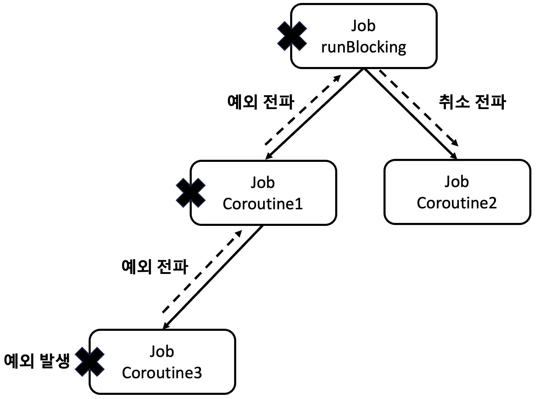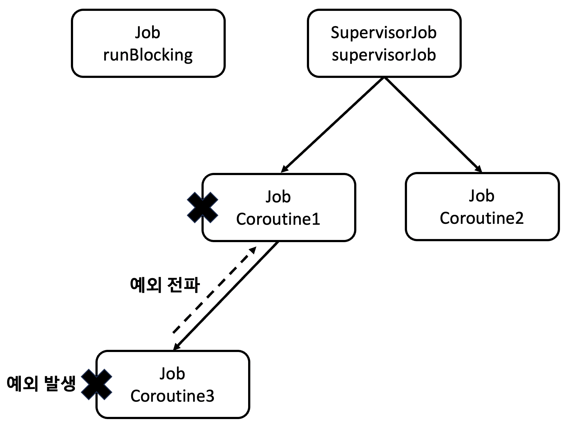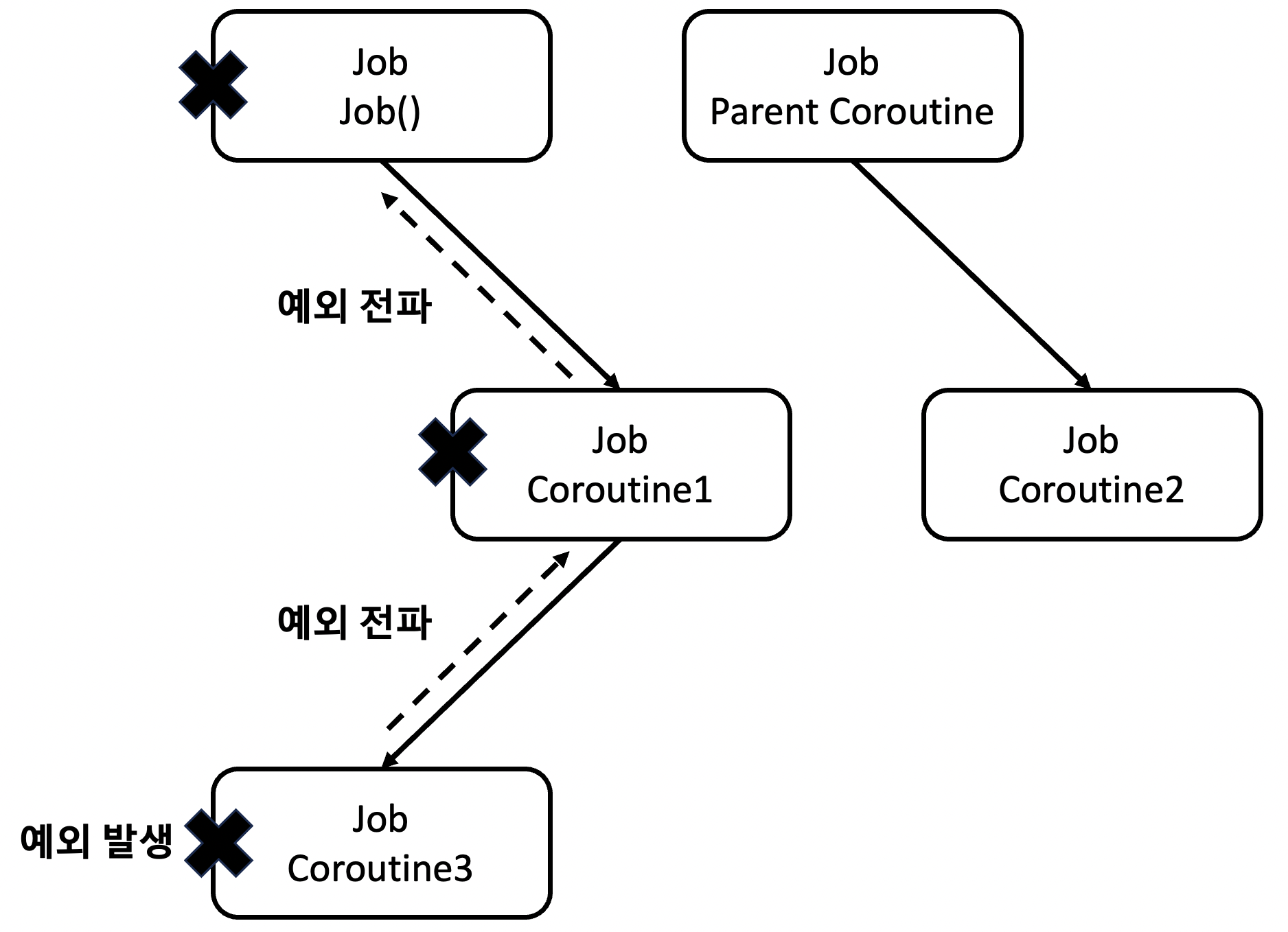 - 코루틴에서 발생한 예외는 부모 코루틴으로 전파되며, 적절히 처리되지 않으면 최상위 루트 코루틴까지 전파된다.