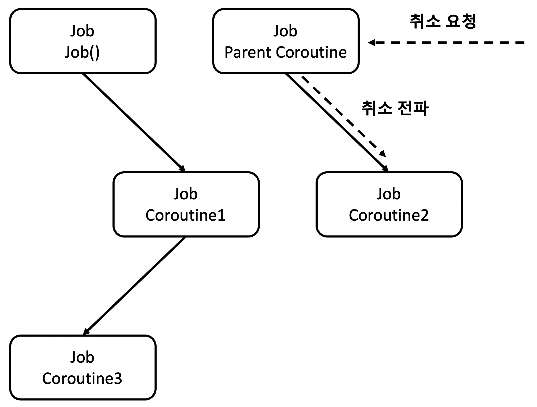 - CancellationException이 전파되지 않는 이유는 CancellationException은 코루틴을 취소하기 위한 특별한 예외이기 때문이다. Job 객체에 cancel 함수를 호출하면 CancellcationException의 서브 클래스인 JobCancellation Exception이 발생해 코루틴이 취소된다.